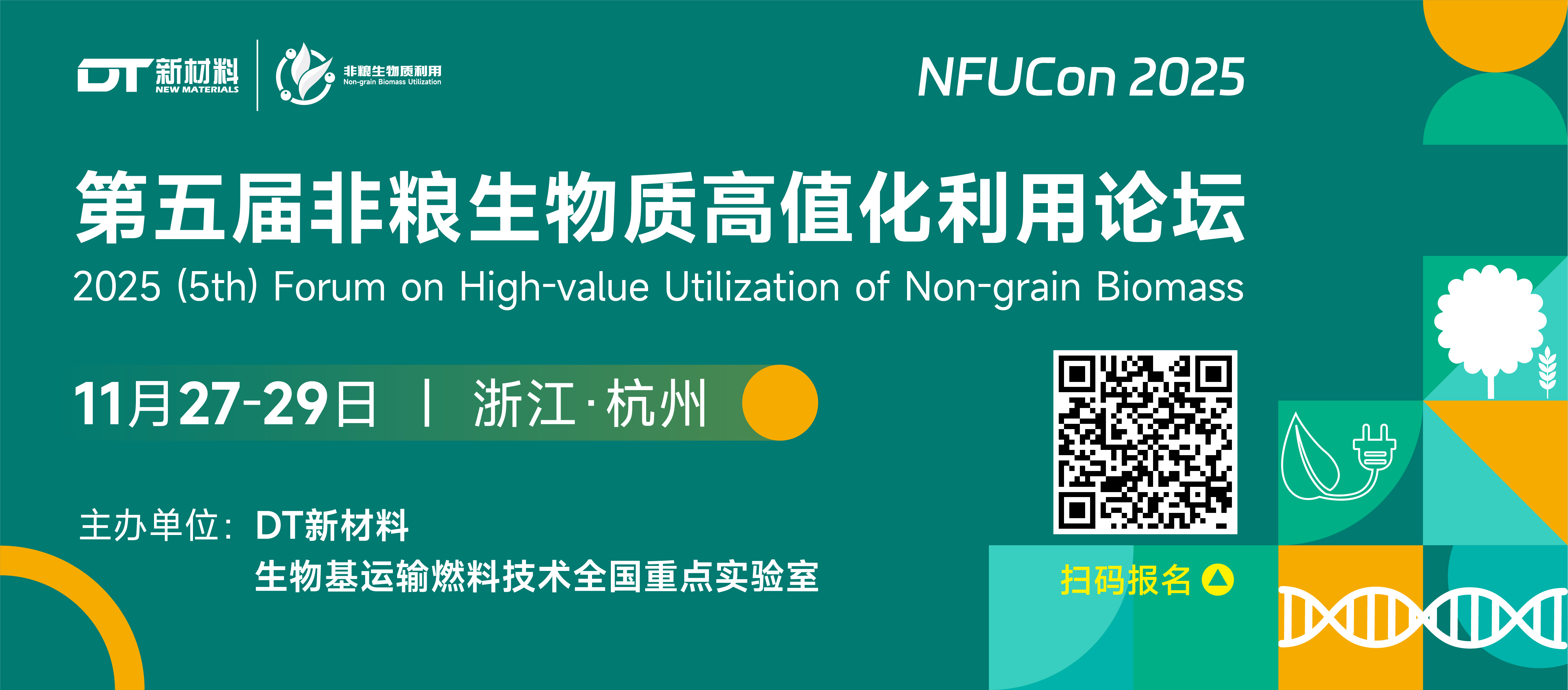 聚焦非粮生物基领域创新科研成果和商业化可行性,“2025(第五届)非粮生物质高值化利用论坛(NFUCon 2025)”将于2025年11月27-29日在浙江·杭州举办,由DT新材料与生物基运输燃料技术全国重点实验室共同主办。以“聚四海群贤,助非粮启‘杭’”为主题,将邀约业界上下游代表性政府园区、企业与专家,探讨生物质绿色预处理、非粮糖、生物质基化学品和材料、生物质能(甲醇、燃料乙醇、生物沼气、可持续航空燃料(SAF))等重要战略方向,共同推动非粮生物质大规模应用,助力实现双碳目标。