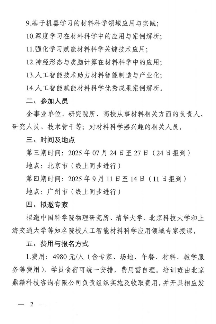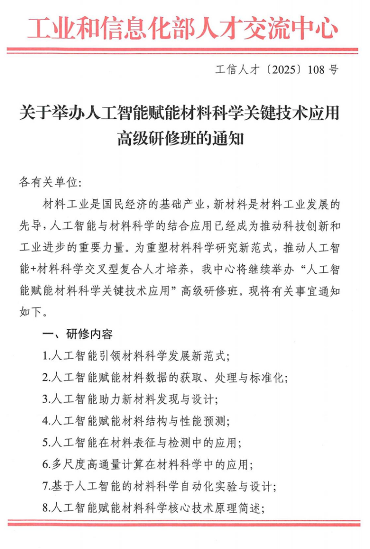工信部关于举办人工智能赋能材料科学关键技术应用高级研修班的通知