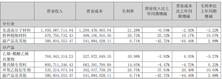 营收下降主要原因是:部分产品价格同比有所下降,而净利润同比增长的原因是原材料价格同比有所下降,EC、UHMWPE、电子特气、PLA等新产品开始贡献利润。