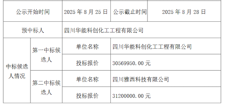 信息显示,第一中标候选人为:四川华能科创化工工程有限公司,投标报价30569950元。