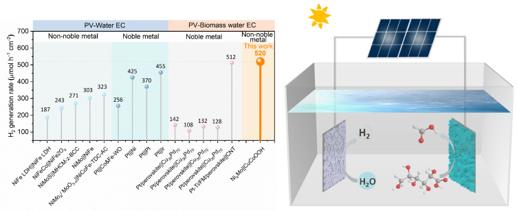 氢气生成速率达500+ µmol h⁻¹ cm⁻²,远超传统光伏-水电解系统。