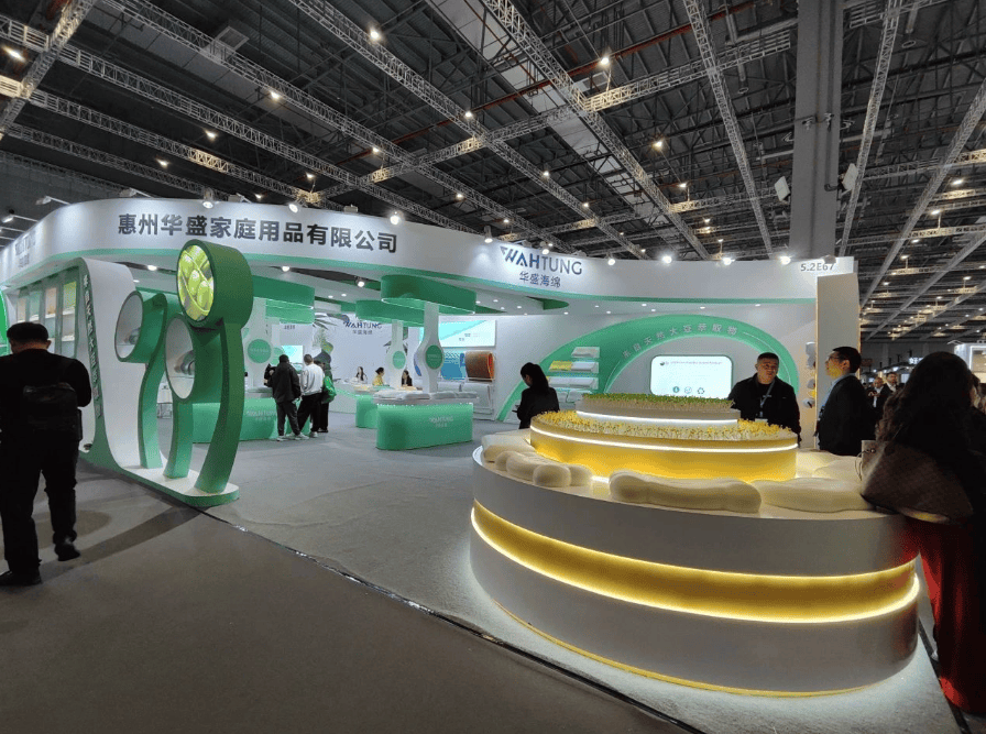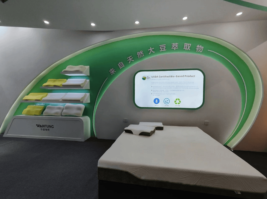 惠州华盛家庭用品有限公司(简称:华盛海绵)展出的生物基聚氨酯海绵,主要生物基原料为大豆油。