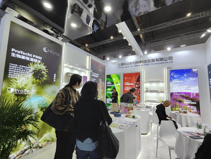 上海环谷新材料科技发展有限公司(简称:HiGoal)展出一系列生物基助剂,用于纺织面料领域,包括:生物基吸湿排汗剂、生物基消臭剂、抗菌剂、天然香氛、柔软剂,HiGoal反馈生物基助剂系列广受客户欢迎,已成为传统纺织厂的"减碳军师"。