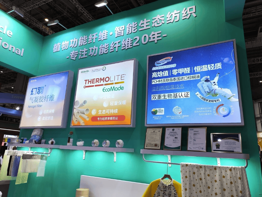 青岛邦特纤维有限公司(简称:邦特纤维)展出生物基智能调温纤维,原料同样来自棕榈油,主攻家纺领域。