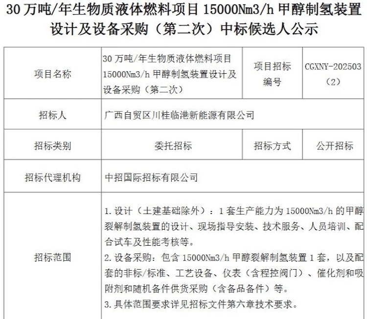 7月21日,广西自贸区川桂临港新能源有限公司30万吨/年生物质液体燃料项目15000Nm³/h甲醇制氢装置设计及设备采购招标公告。